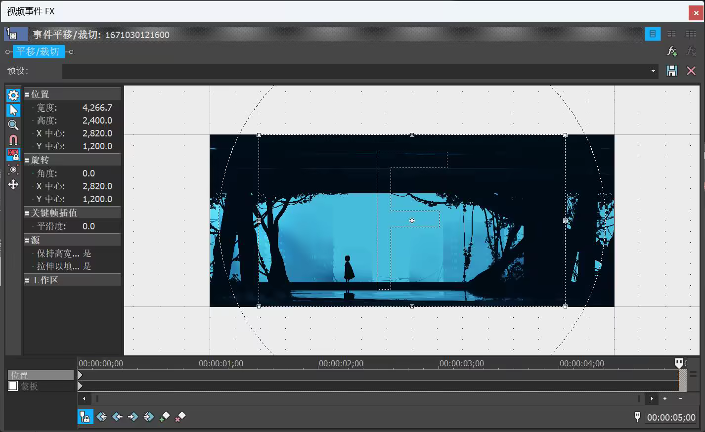 如图为Vegas的平移裁剪功能,是非常简陋的,但配合散焦特效也能消除不和谐感。其中的蒙板功能在平时编辑时也是非常有用的,可以去掉素材中的某个部分,或只显示某个部分。