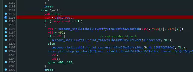 如图直接输 flag 会提示 Incorrect ,随后我在后面加参数运行也不会有报错,猜测就是把 flag 后面的参数拿去验证了。先进 seccomp_shell::shell::verify::h898bf5fa26dafbab(v154, v175[3], v175[5]) 函数看看