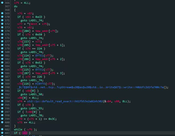 我一开始以为这个就是比较函数,但是仔细看发现根本没有比较的操作,而是又是在对 opcode 进行修改操作,并且将 opcode 数据发送到 nc 端,与之前那个 if 里的代码行为一致,应该是编译优化导致的。