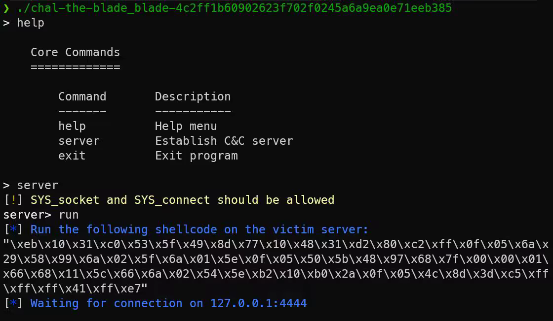 首先运行程序,会进入一个交互界面,然后提示可以进入 server 模式,并且 run 之后打印出来一串 opcode